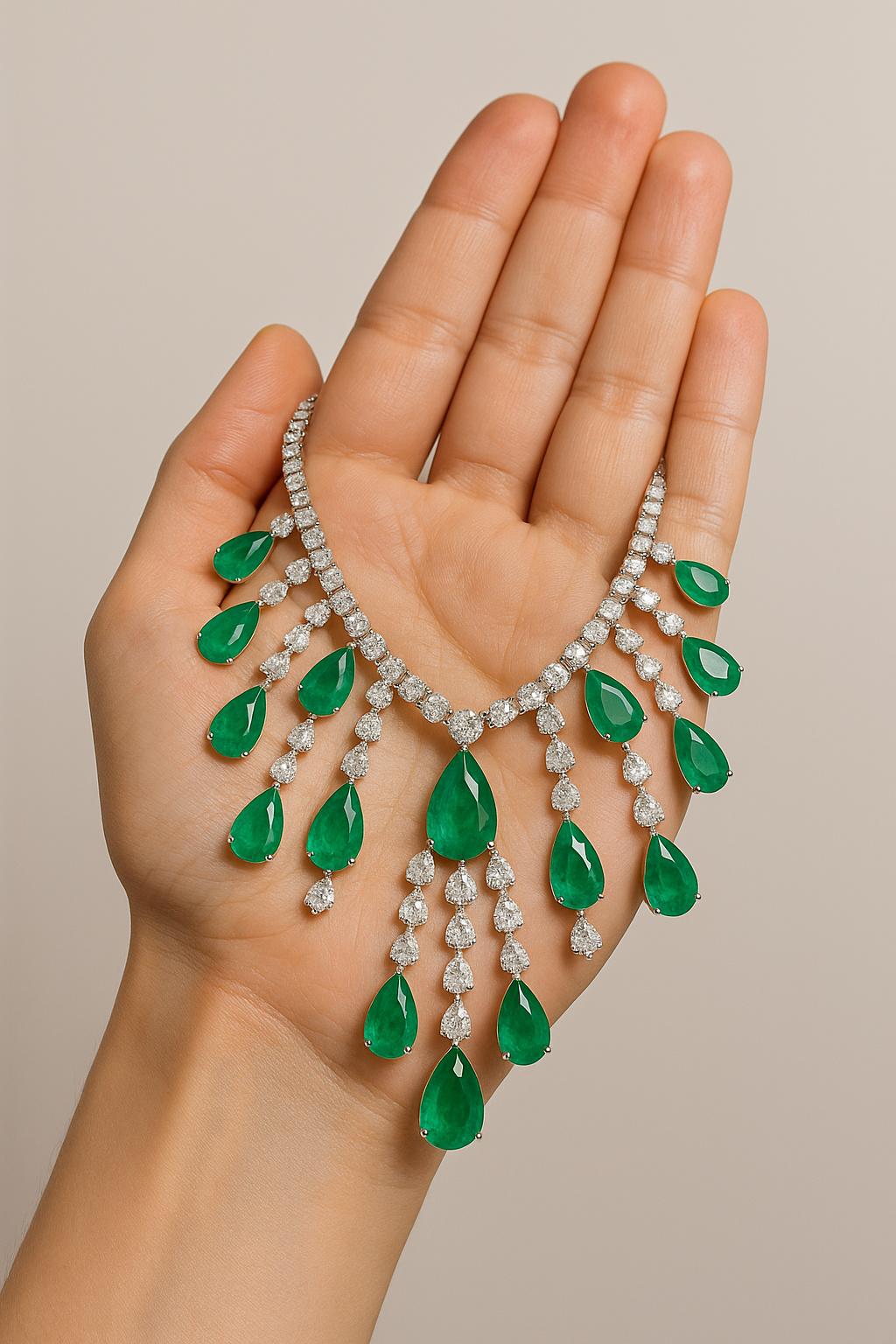 Each gemstone is hand-selected and precision-set to perfection, ensuring unmatched radiance, balance, and flow. Designed to rest gracefully along the neckline, this masterpiece captures light from every angle, creating a mesmerizing sparkle that defines high jewelry artistry.