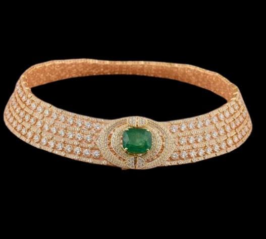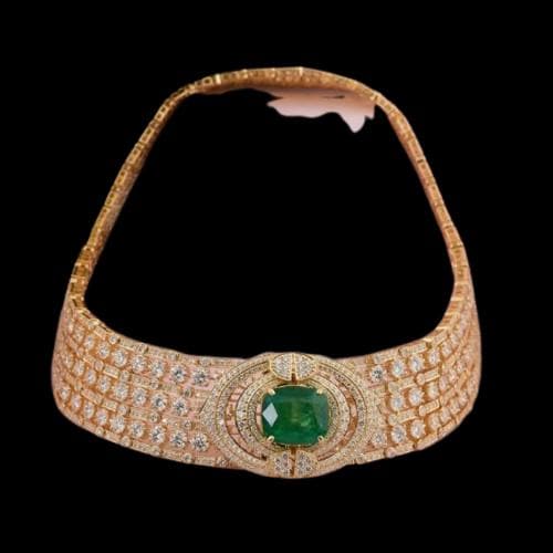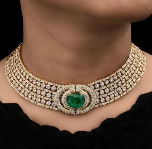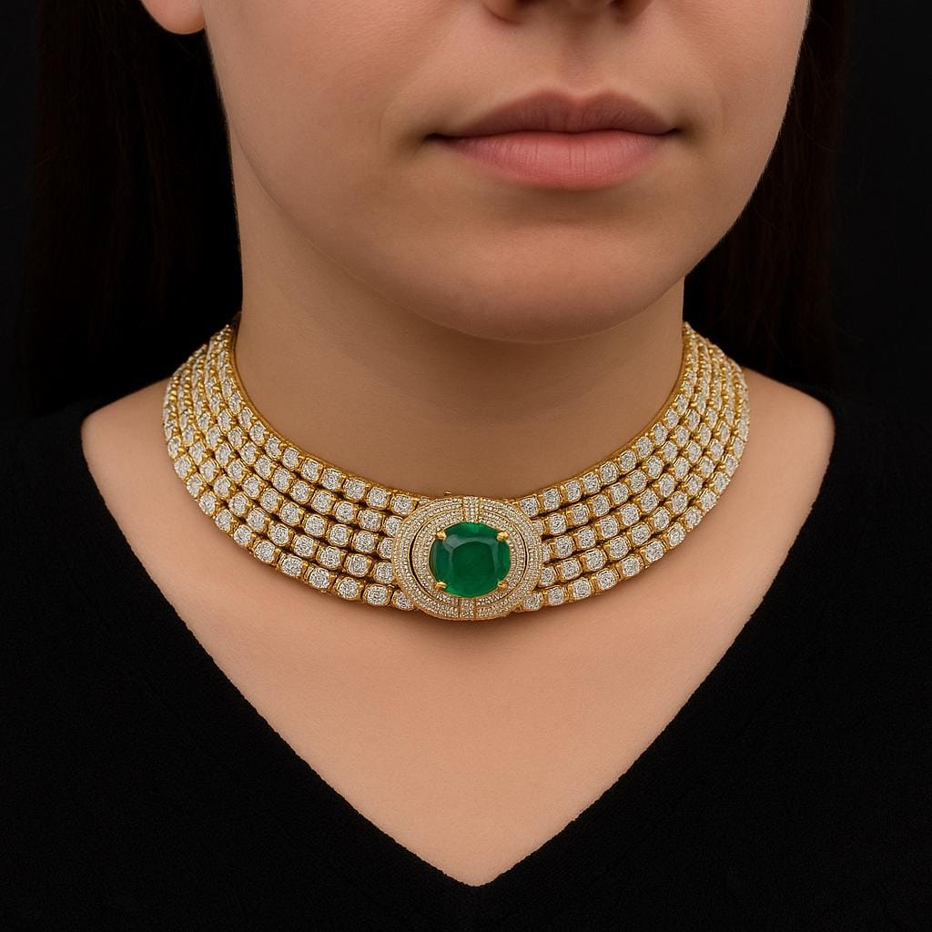 Designed to rest gracefully around the neckline, this statement choker exudes royal elegance and sophistication. Each gemstone is meticulously hand-set to ensure unmatched brilliance, while the lustrous gold base enhances the rich green hue of the emeralds and the fire of the diamonds. Perfect for weddings, red-carpet events, or milestone celebrations, this necklace is an heirloom-worthy treasure that captures pure luxury.