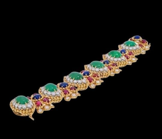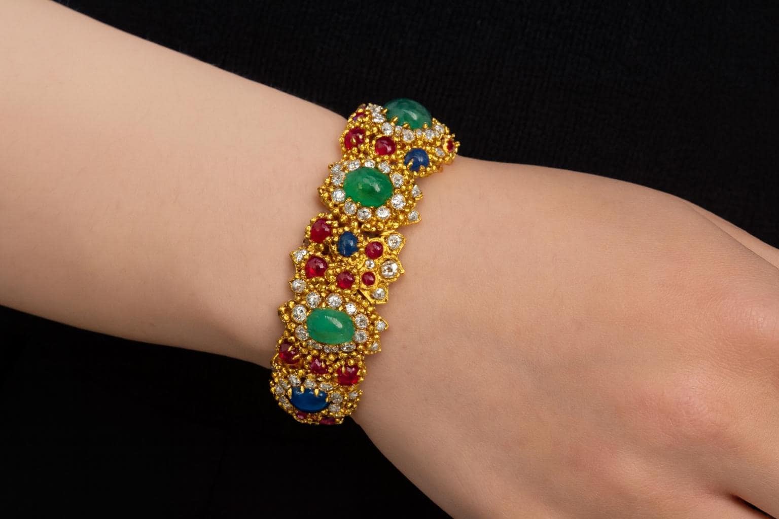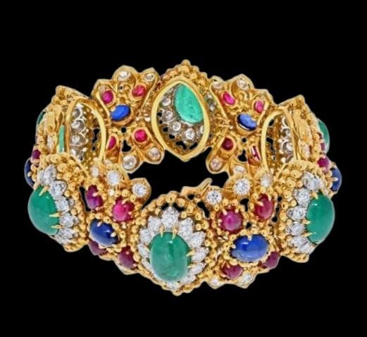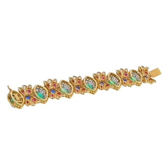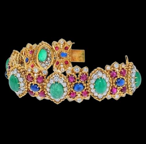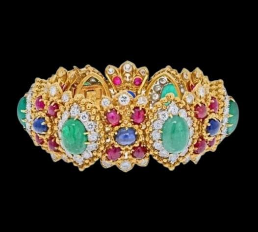Embrace the elegance of royal design with this breathtaking 18K Yellow Gold Bracelet, adorned with vivid green emerald cabochons, fiery rubies, and sparkling natural diamonds. Each gemstone is hand-selected for its color intensity and brilliance, creating a mesmerizing blend of luxury and artistry.