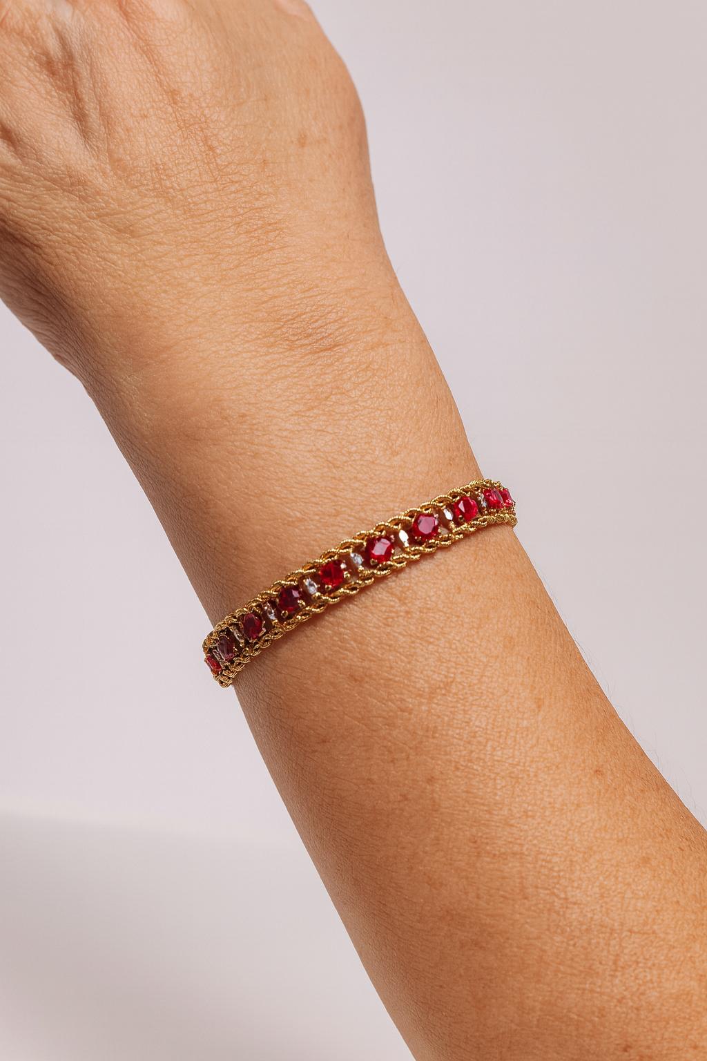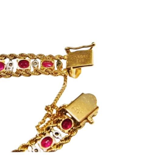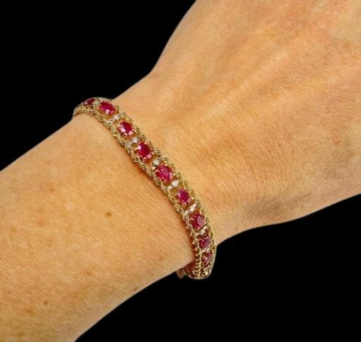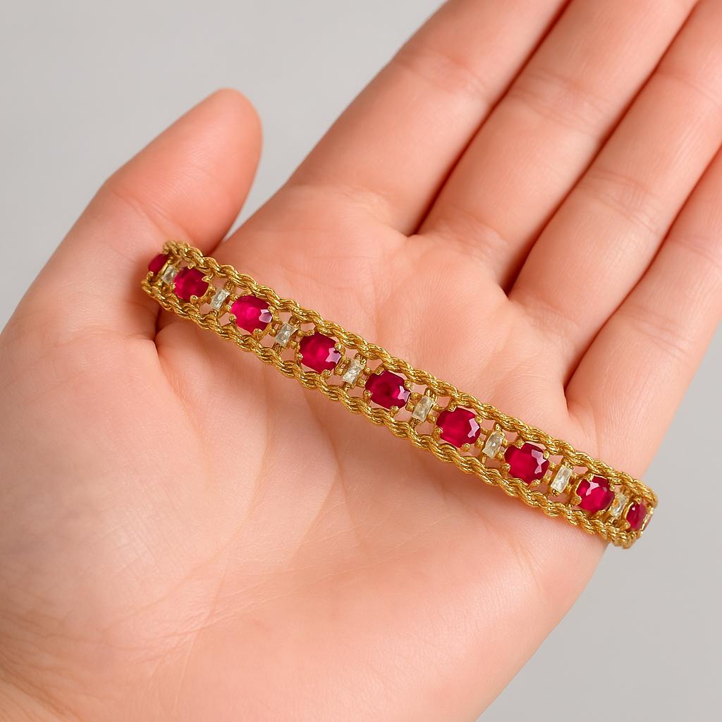 Each natural ruby radiates a deep, vivid red hue — a hallmark of high-quality gemstones — symbolizing passion and strength. Surrounding the rubies are meticulously hand-set brilliant-cut natural diamonds, chosen for their exceptional clarity and fire. The contrast between the glowing rubies, shimmering diamonds, and warm 18K gold creates a breathtaking composition that captures light from every angle.