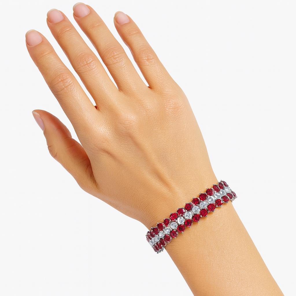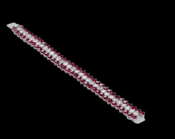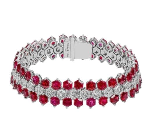 The octagonal shape of the rubies enhances their brilliance and symmetry, creating a luxurious geometric design complemented by the cool luster of 18K white gold. Each ruby is precisely set with sparkling accent diamonds that illuminate the bracelet with breathtaking fire and elegance.