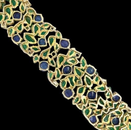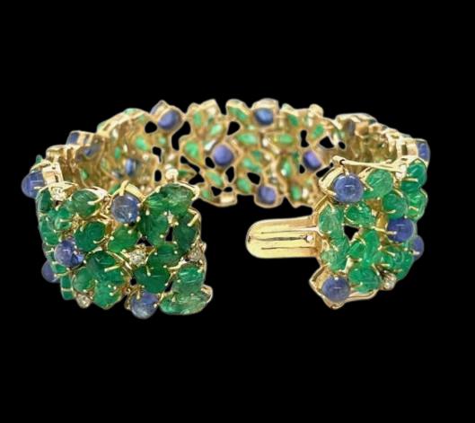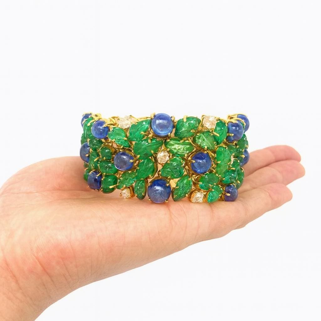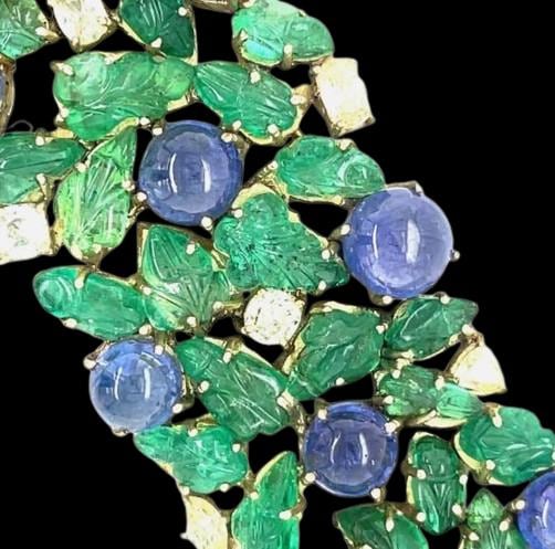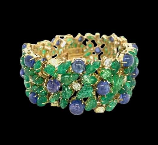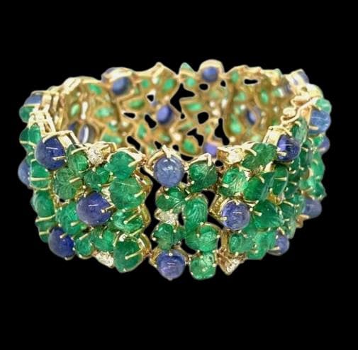 Description: Experience true luxury with this breathtaking 14K Yellow Gold Tanzanite and Carved Emerald Bracelet, beautifully accented with 2.85 carats of natural brilliant diamonds. Each vibrant blue-violet Tanzanite cabochon radiates rare elegance, harmoniously paired with intricately hand-carved emerald leaves that bring a touch of artistry and sophistication.