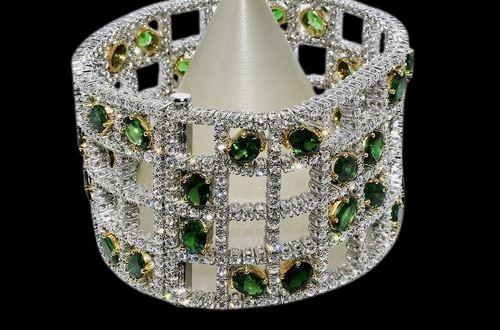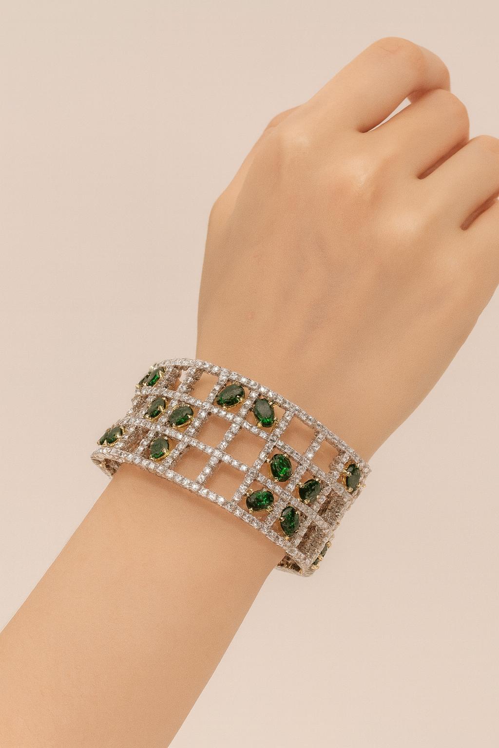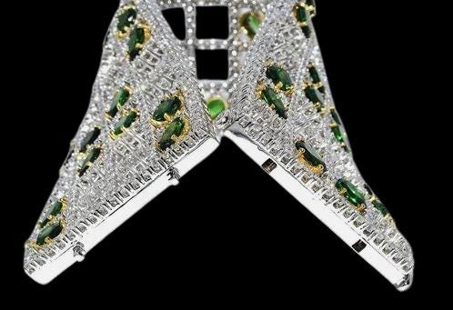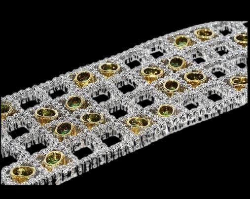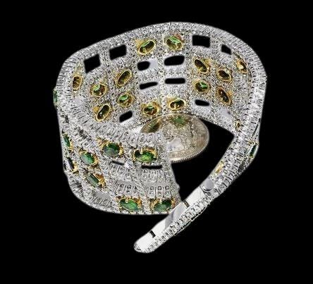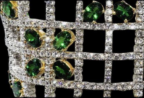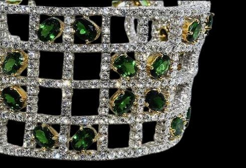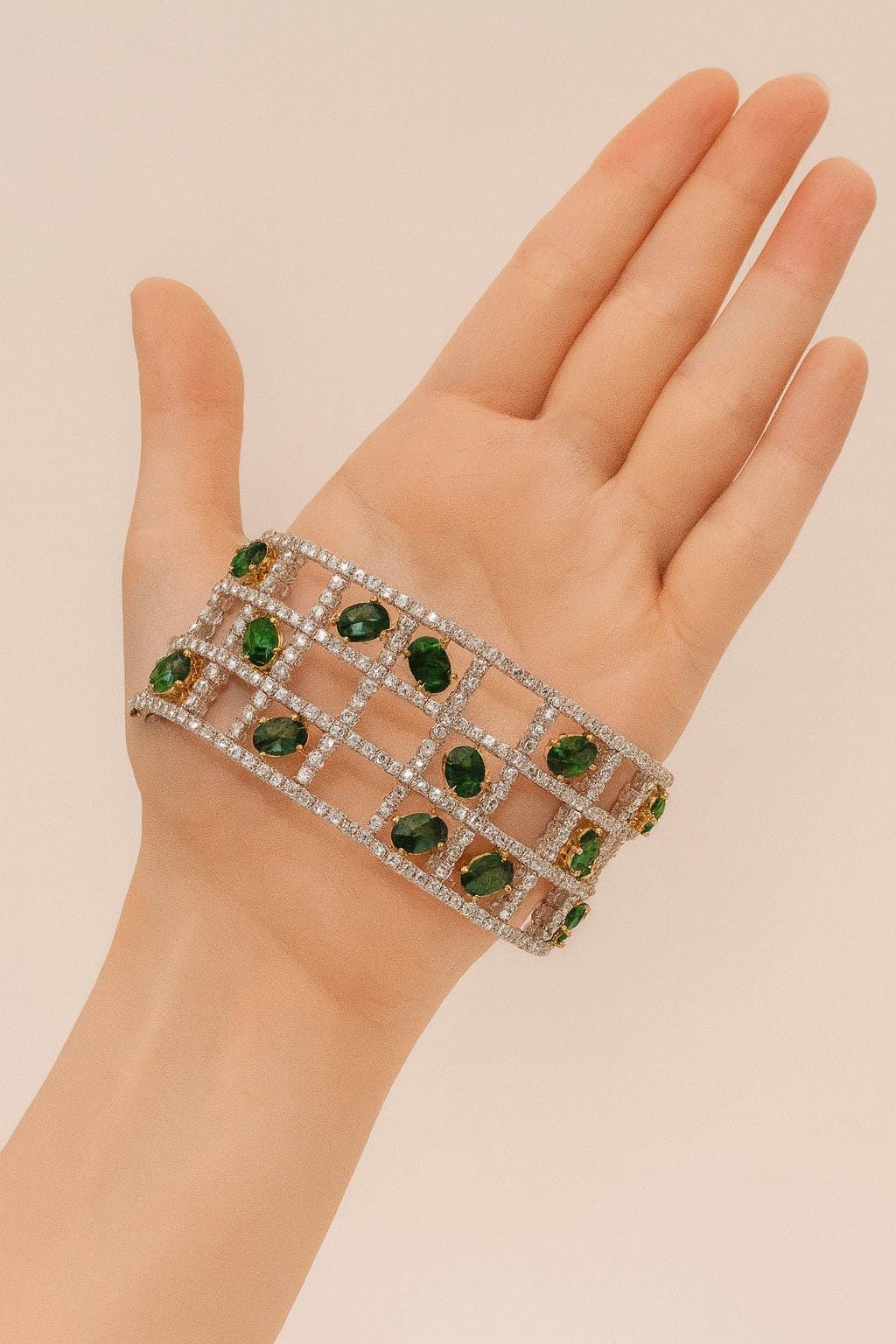 Crafted from solid 18K white gold, the bracelet showcases an intricate openwork pattern with alternating rows of diamonds and tsavorites, giving it depth, dimension, and unmatched brilliance. Designed to make a statement, it's the perfect piece for formal occasions, galas, or as a collector's treasure.