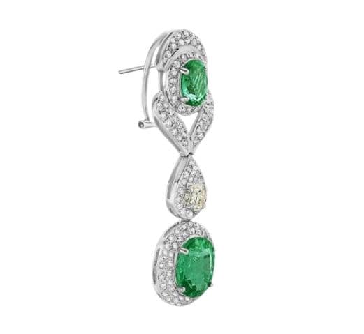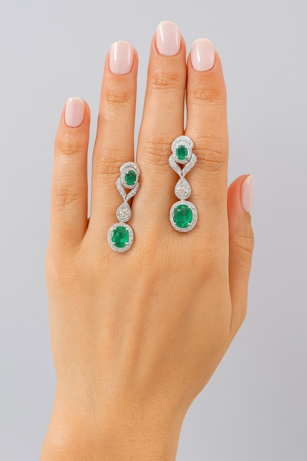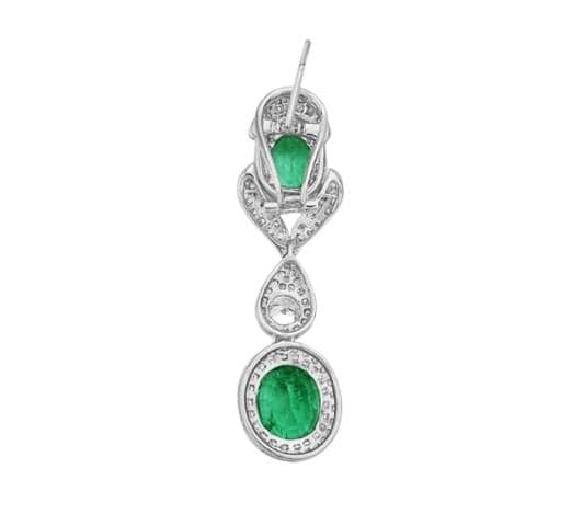 Description: Experience the allure of timeless elegance with these stunning Luxury 18K White Gold Emerald and Diamond Drop Earrings, a perfect blend of sophistication and craftsmanship. Each earring features vivid natural green emeralds, gracefully surrounded by brilliant-cut natural diamonds, creating a dazzling halo effect that enhances the gem’s deep, rich hue.