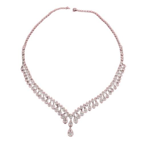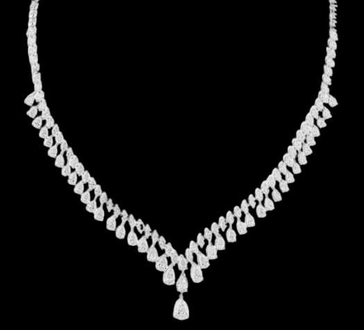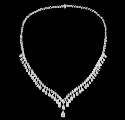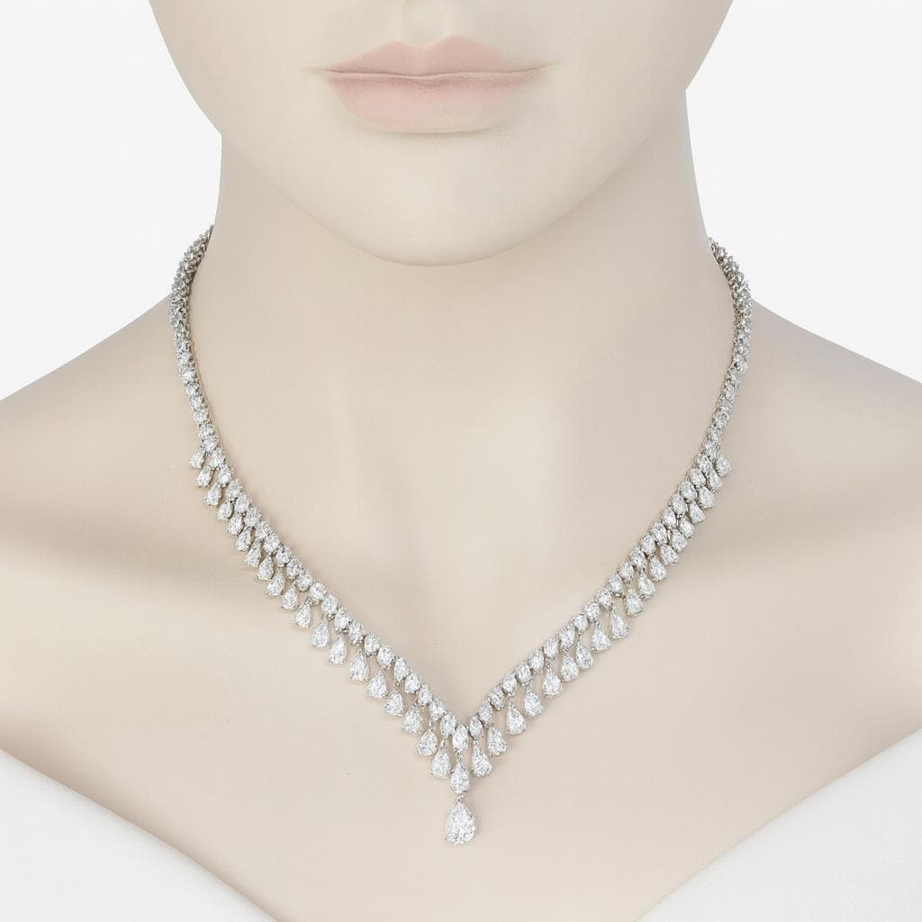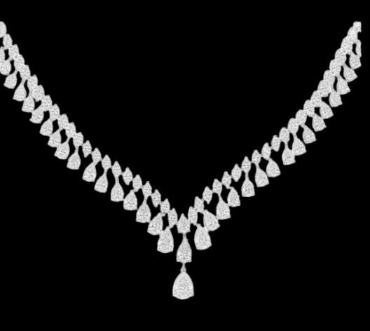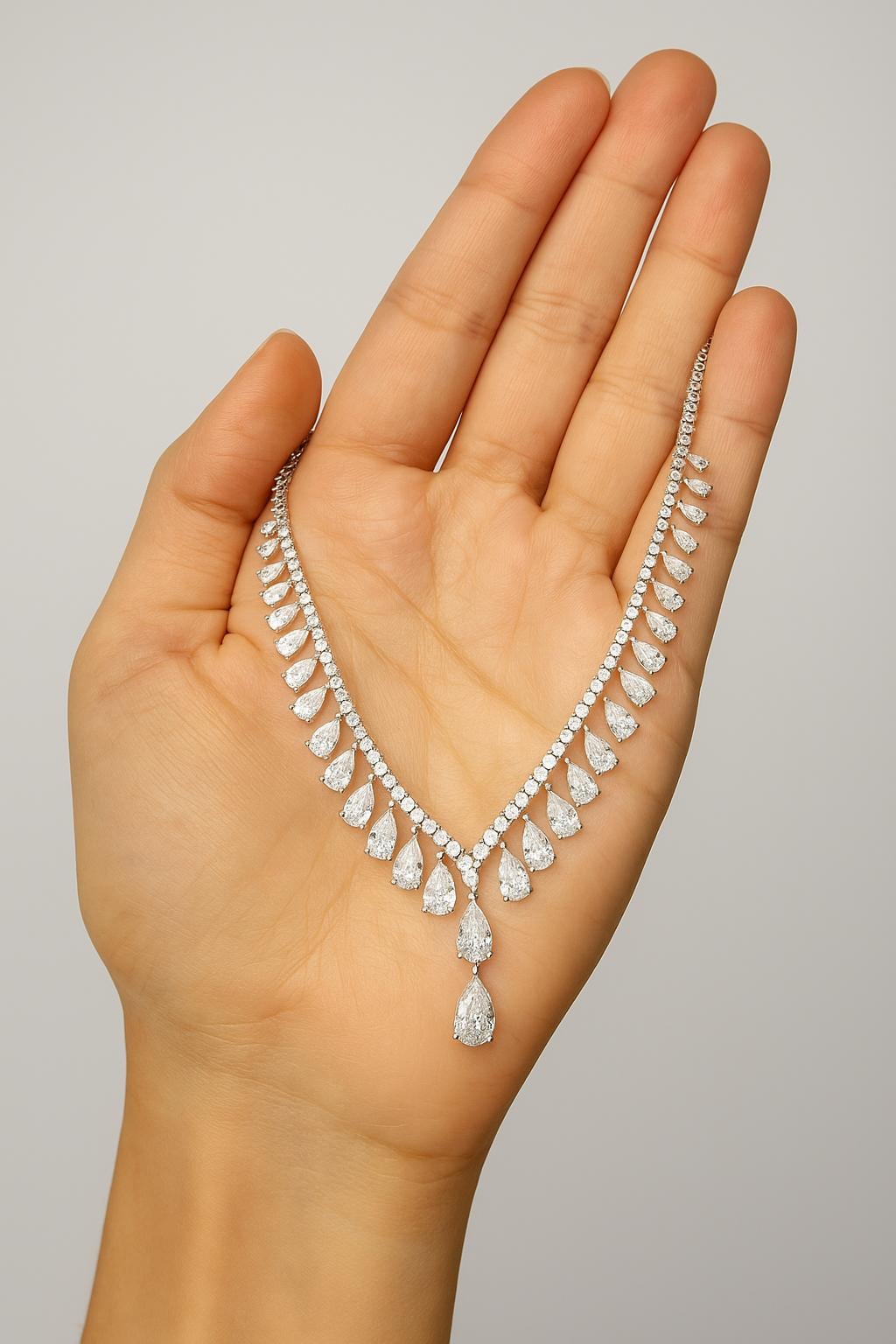Each diamond is precision-cut in a stunning pear shape, creating a fluid sparkle that perfectly contours the neckline. Set in solid 18K white gold, this necklace embodies exceptional quality and refinement, making it the perfect choice for weddings, galas, red-carpet events, or anniversary celebrations.