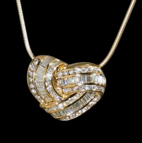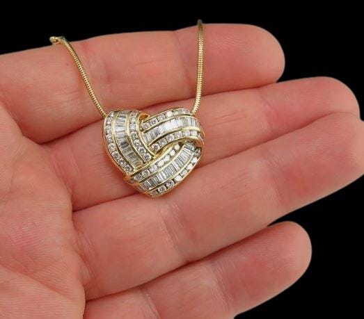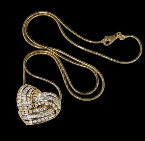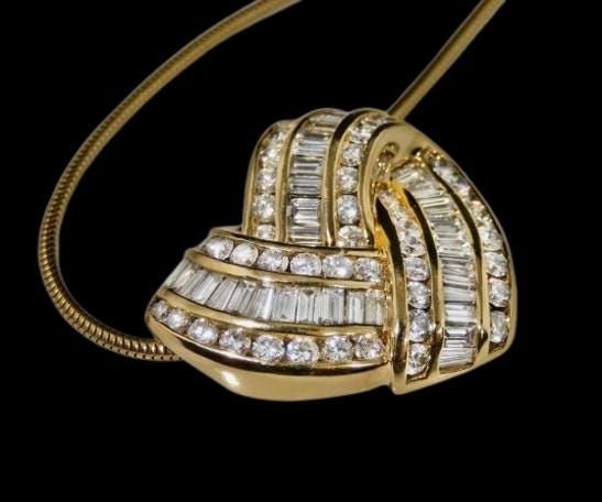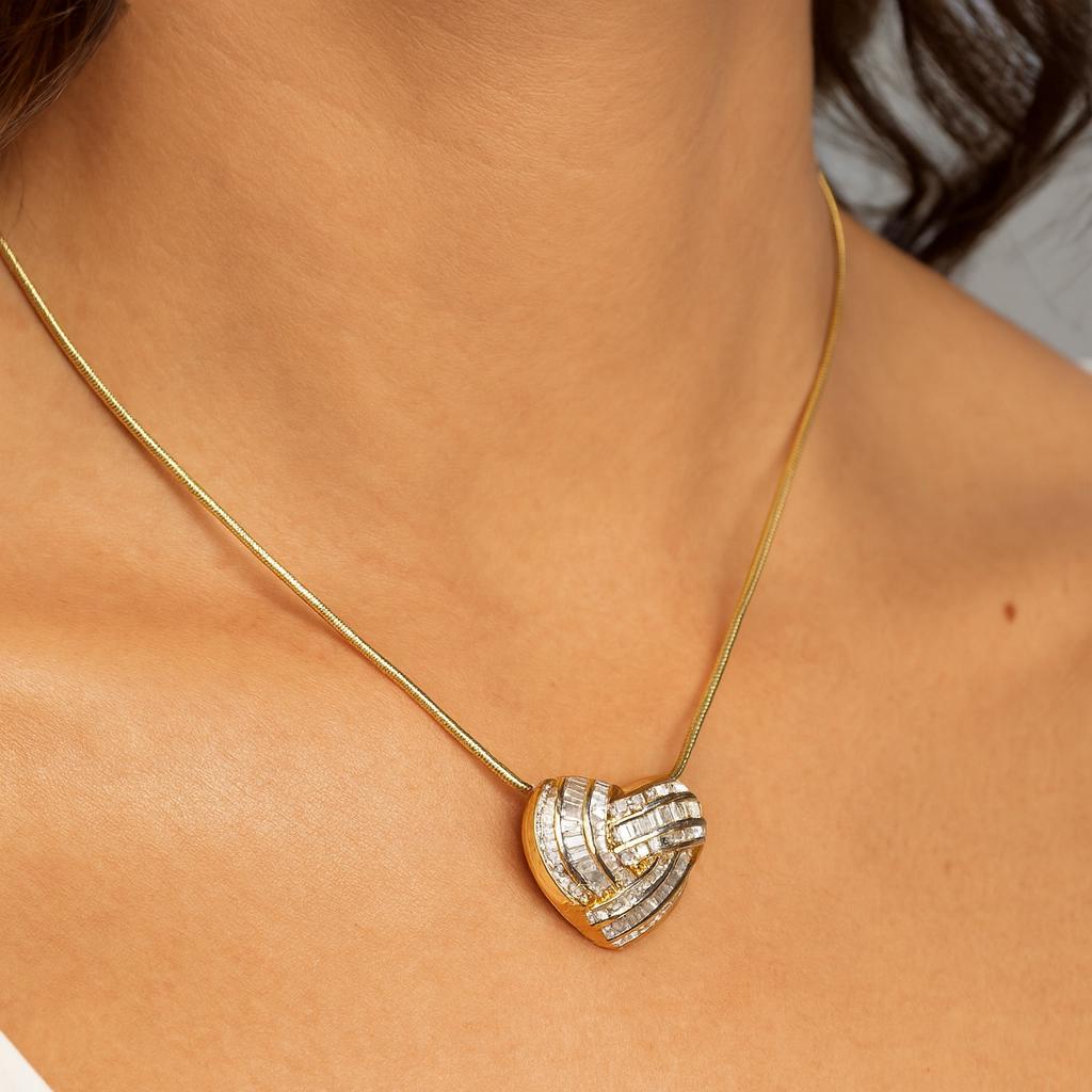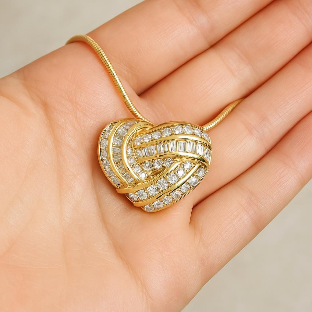 The heart-shaped pendant showcases an intricate arrangement of round and baguette-cut diamonds, each expertly hand-set in solid 18K yellow gold to maximize sparkle and dimension. Suspended from a sleek gold chain, this piece is both luxurious and versatile — perfect for weddings, anniversaries, or as a heartfelt gift for someone special.