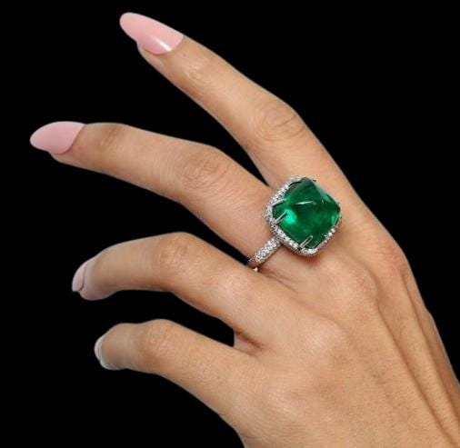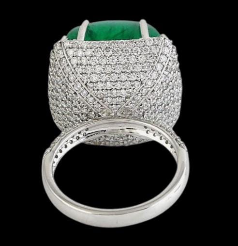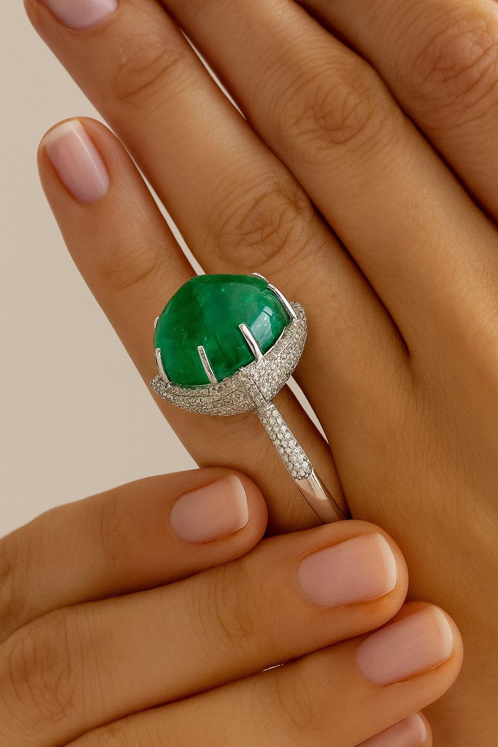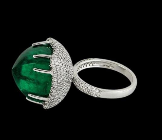 Description: Indulge in timeless sophistication with this 18K White Gold Emerald Statement Cocktail Ring, a true masterpiece of luxury craftsmanship. Featuring a vivid green natural emerald as its centerpiece, this ring is surrounded by brilliant pavé-set diamonds that enhance its regal glow. Handcrafted from solid 18K white gold, it exudes elegance and prestige, making it the perfect accessory for special occasions, red-carpet events, or as a meaningful anniversary or engagement gift. The bold emerald sits high in an intricate diamond-studded setting, symbolizing elegance, strength, and love. This exquisite piece of fine jewelry beautifully blends modern artistry with timeless charm, destined to be a treasured heirloom for generations. ✨ Details: