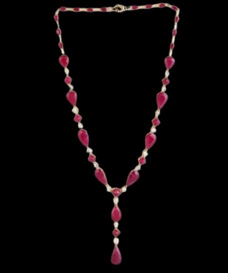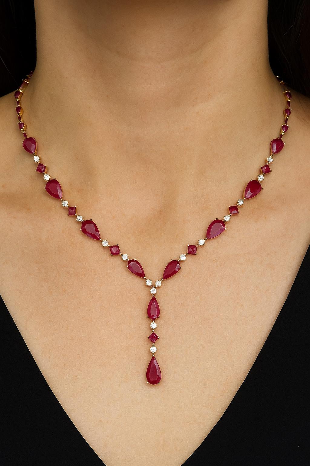Description: Add a touch of timeless sophistication to your collection with this Elegant Ruby and Diamond Necklace in 18K Yellow Gold — a breathtaking piece of fine jewelry designed for women who appreciate classic beauty and modern elegance. This exquisite necklace features natural rubies, each masterfully cut and polished to highlight their deep, vivid red hue — the color of love and passion. Alternating with sparkling white diamonds, every gemstone is meticulously hand-set in solid 18K yellow gold, creating a perfect balance of brilliance and warmth. The graceful design culminates in a striking drop centerpiece, enhancing its luxurious appeal. Ideal for bridal wear, anniversaries, birthdays, or special celebrations, this ruby and diamond necklace is a true symbol of romance, strength, and timeless charm. ✨ Details: