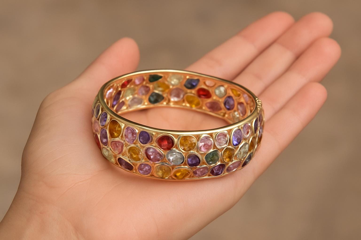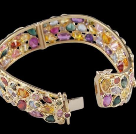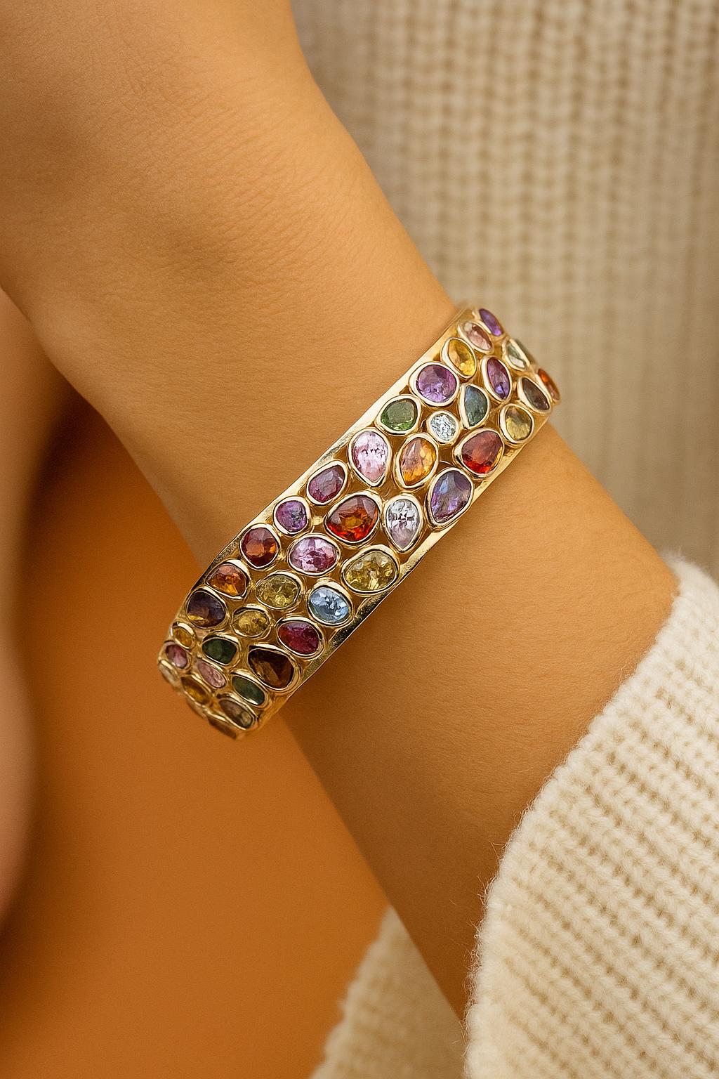 ✨ Why You'll Love It: This luxurious multi-gem bangle brings together the vibrant hues of nature and the richness of solid gold. Each gemstone radiates unique color energy — symbolizing joy, creativity, and harmony. The bracelet’s impeccable craftsmanship and eye-catching design make it a timeless treasure that adds a touch of royalty to every look.