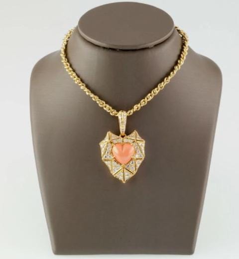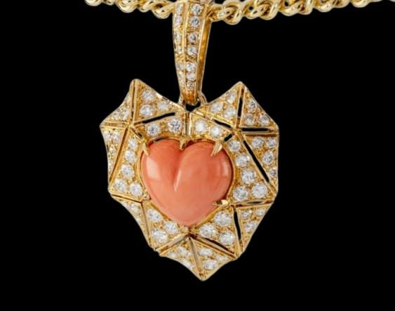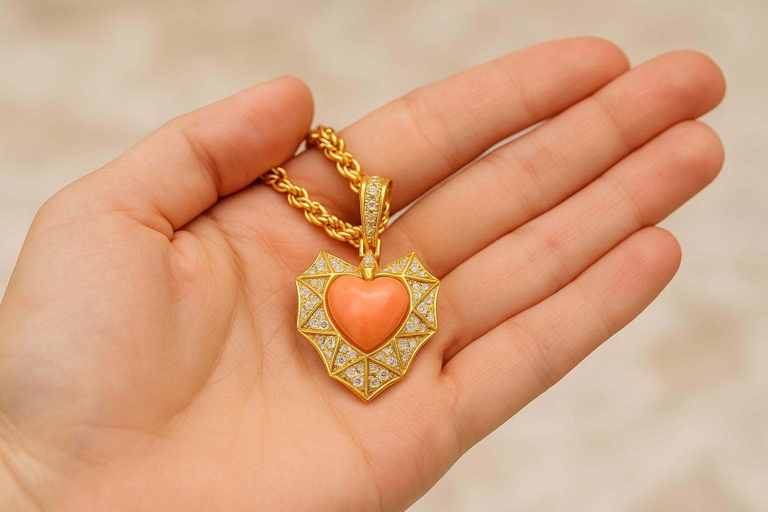 Experience the epitome of luxury and timeless artistry with this High Jewelry 18K Yellow Gold Diamond and Coral Heart Pendant Necklace — a masterpiece that beautifully blends the warmth of natural coral with the brilliance of fine diamonds. Designed for the true connoisseur of elegance, this pendant radiates sophistication and charm, perfect for those who appreciate rare, handcrafted jewelry pieces.