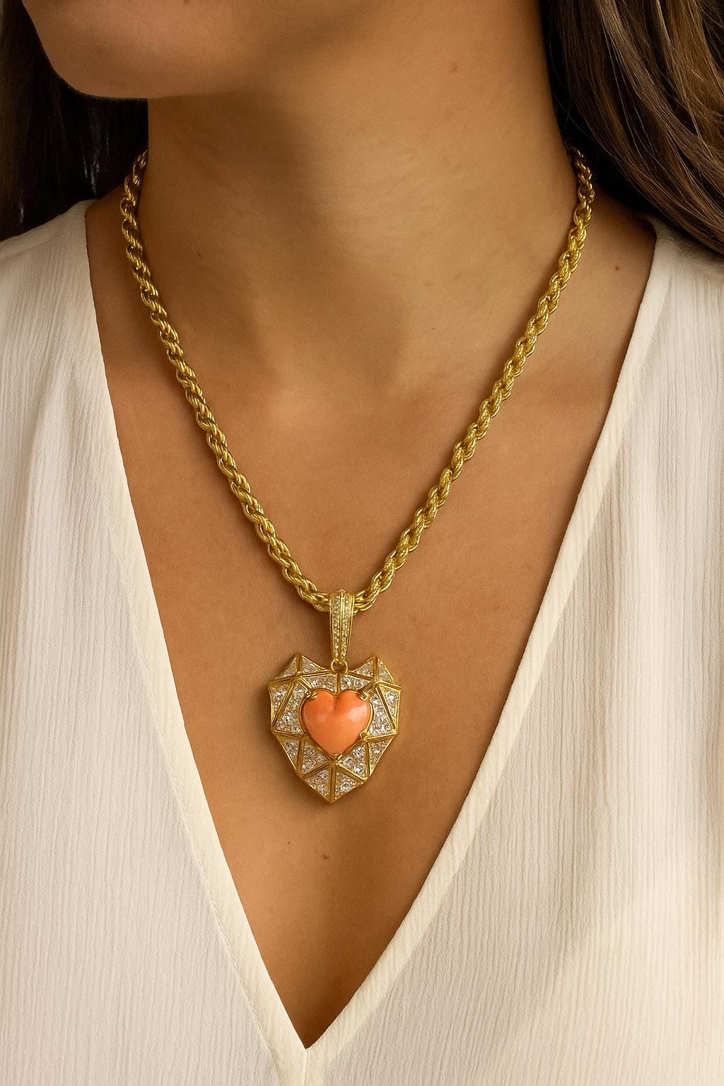 The pendant features a vivid coral heart gemstone, symbolizing love and vitality, gracefully surrounded by a geometric frame of brilliant-cut natural diamonds. Each diamond is meticulously handset in rich 18K solid yellow gold, reflecting unmatched craftsmanship and opulence. The pendant hangs from a luxurious gold rope chain, adding both texture and allure to the design.