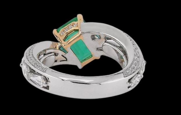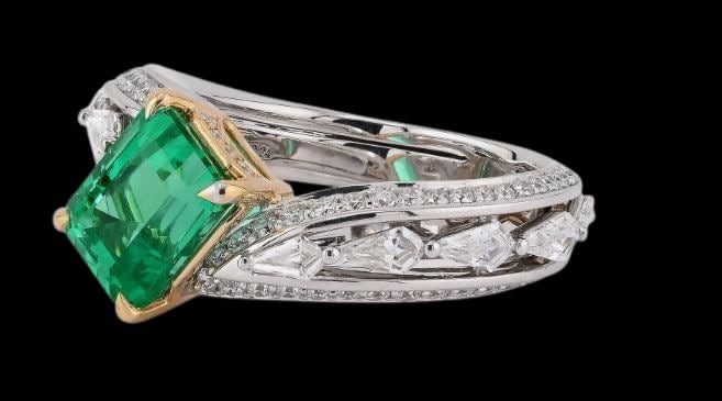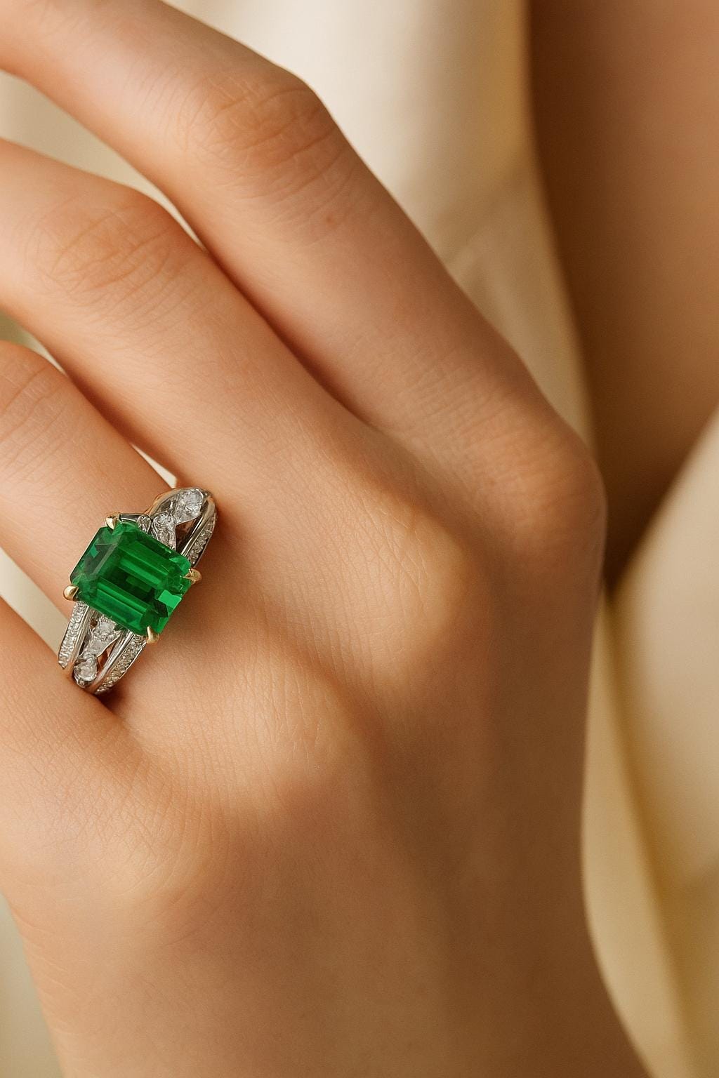 The centerpiece emerald is elegantly framed by brilliant and baguette-cut natural diamonds, meticulously set in a gleaming 18K solid white gold band. The combination of white gold’s cool luster and the emerald’s rich green brilliance creates a breathtaking contrast, making this ring a statement of pure luxury.