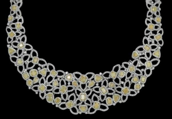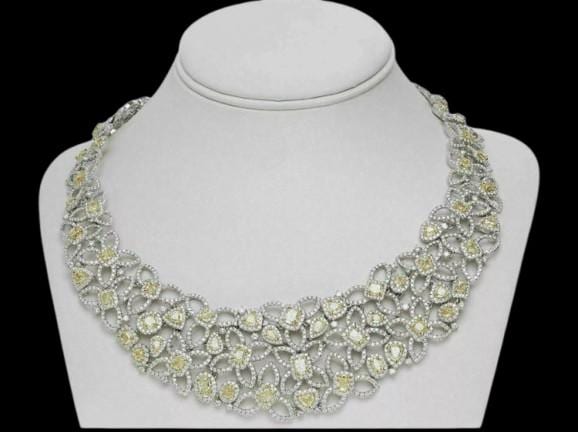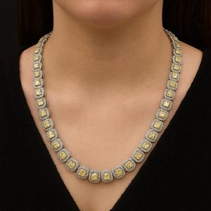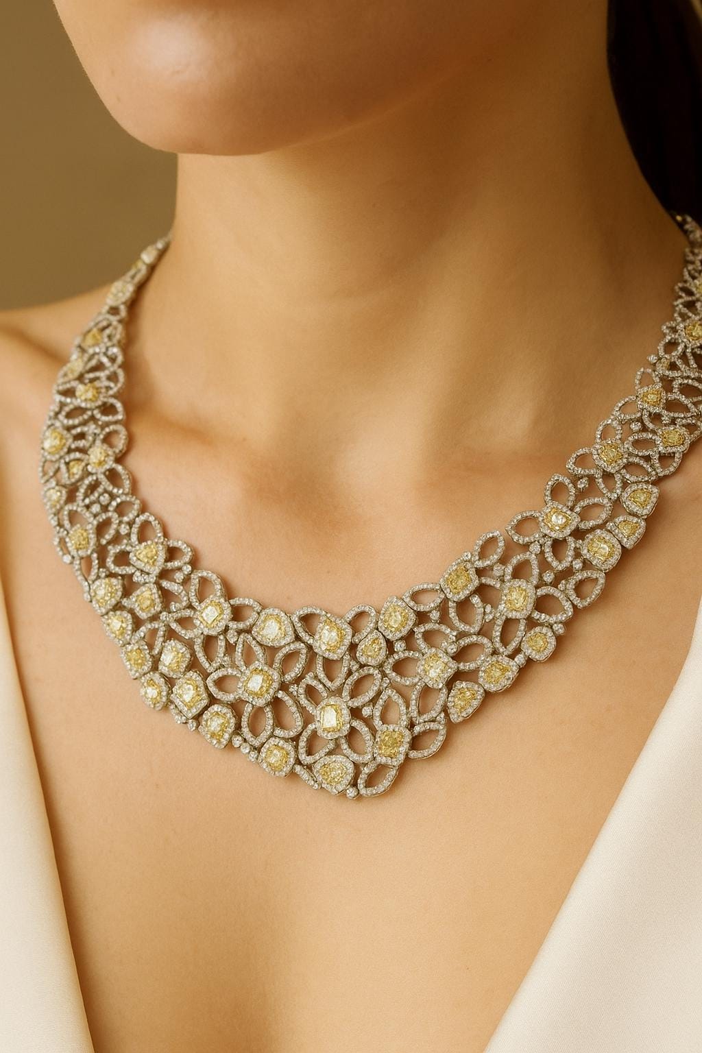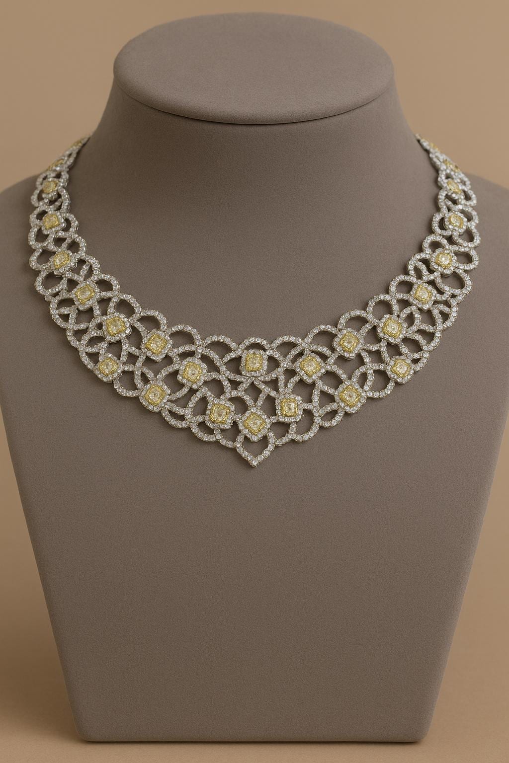 The necklace features a mesmerizing combination of fancy yellow and white natural diamonds, carefully arranged in an intricate openwork pattern resembling delicate flowers and vines. Each fancy yellow diamond radiates warmth and golden fire, beautifully contrasted by the icy sparkle of white brilliant-cut diamonds, all set in elegant 18K white and yellow two-tone gold for maximum luminosity and depth.