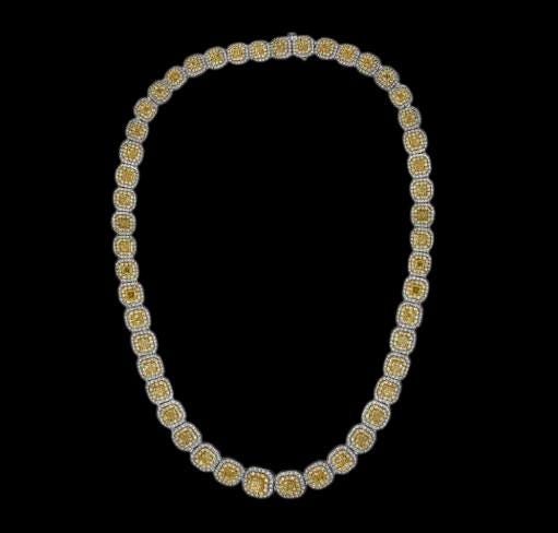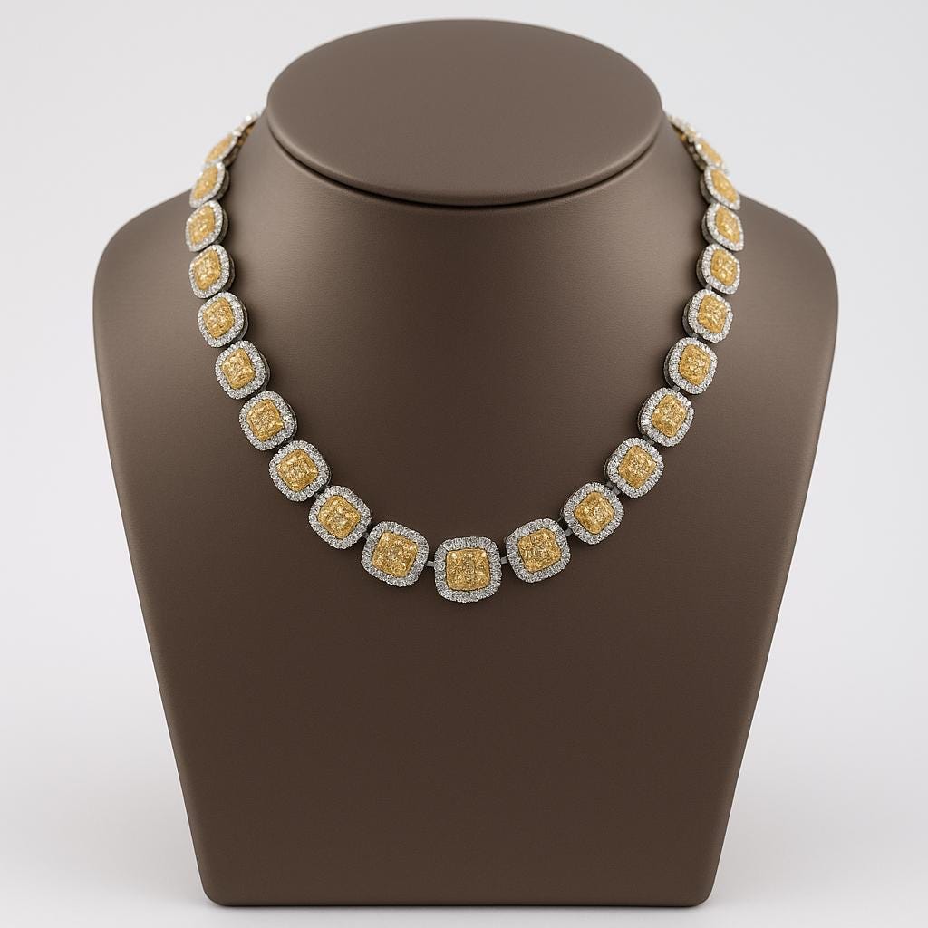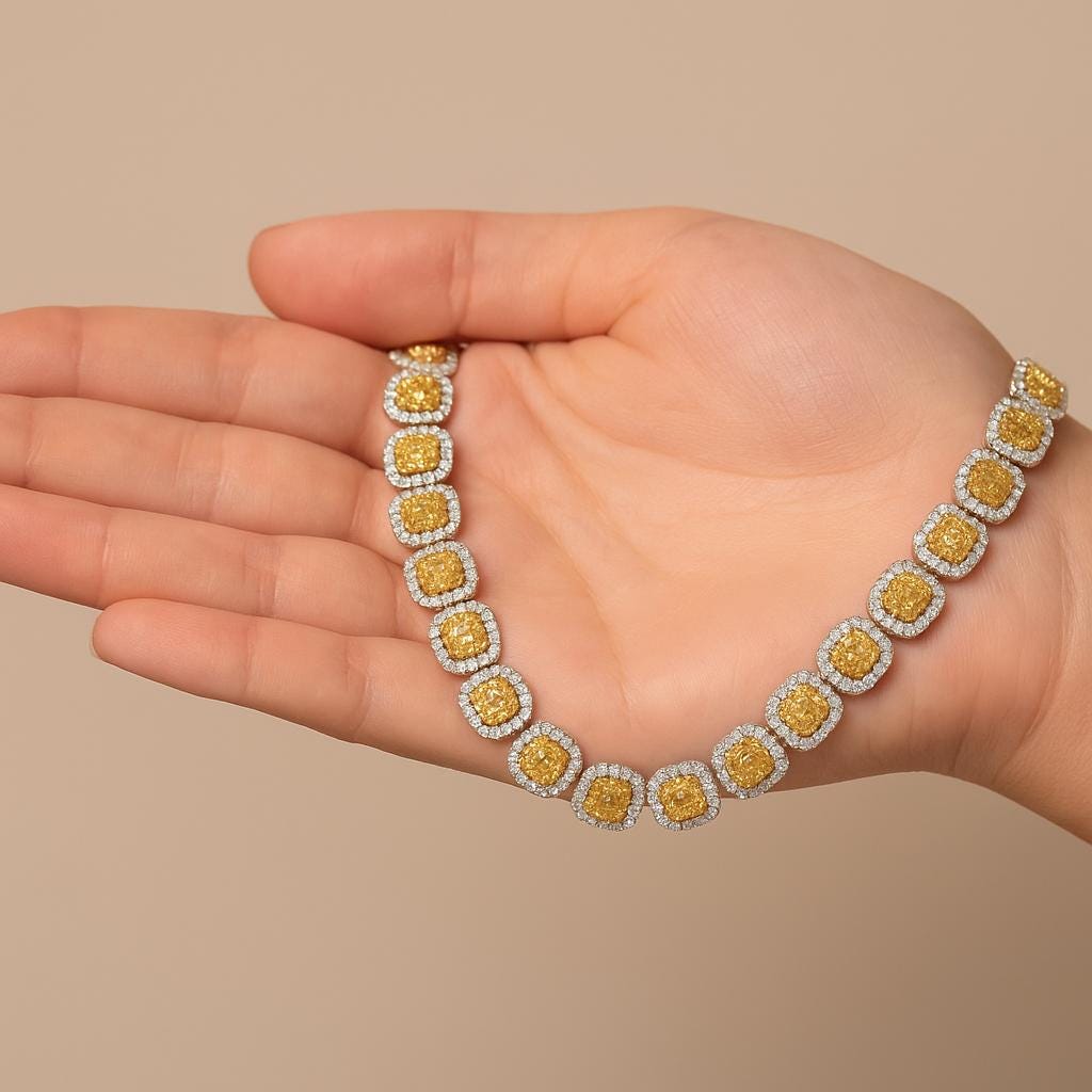 Indulge in the brilliance of timeless luxury with this Large 23.60 Carat Cushion Cut White Diamond Eternity Tennis Necklace in 18K Gold — a masterpiece of exceptional craftsmanship and classic sophistication. Every detail of this necklace has been meticulously designed to highlight the radiant beauty of natural white diamonds, each expertly cut and hand-set to create a continuous stream of sparkle around the neckline.