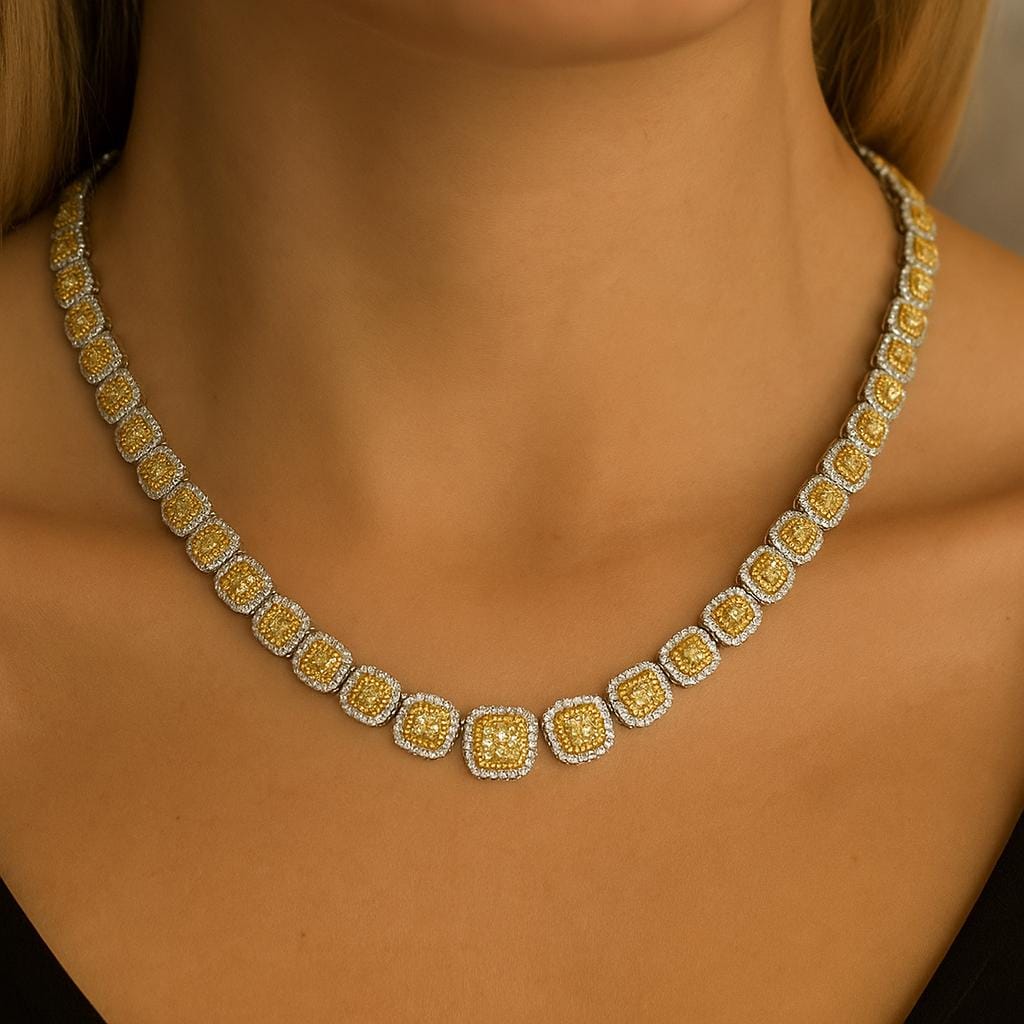 Crafted in solid 18K gold, this elegant piece showcases cushion-cut white diamonds that exude unmatched brilliance and fire. The diamonds are prong-set in a seamless eternity style, symbolizing everlasting love and elegance. The high polish of the gold complements the dazzling stones, giving this necklace an aura of both modern allure and timeless grandeur.