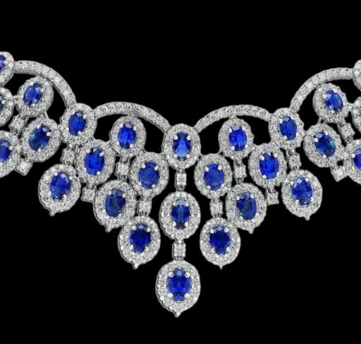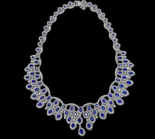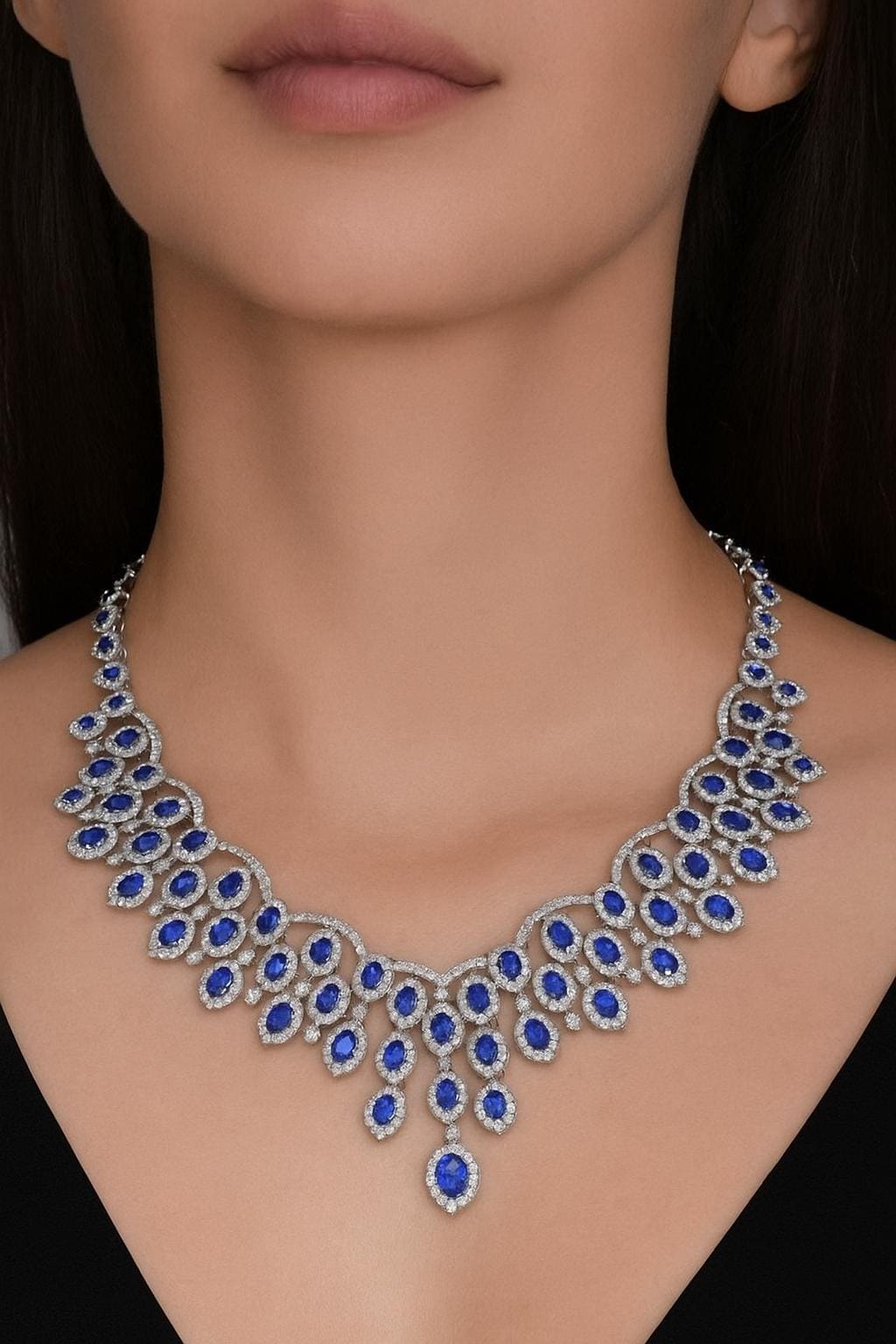 The necklace features AAA-grade deep blue sapphires, each hand-selected for its vivid color, flawless clarity, and unmatched brilliance. These radiant sapphires are complemented by brilliant-cut natural white diamonds, meticulously set in an intricate 3D layered floral and teardrop design, creating a bold and sculptural statement piece.