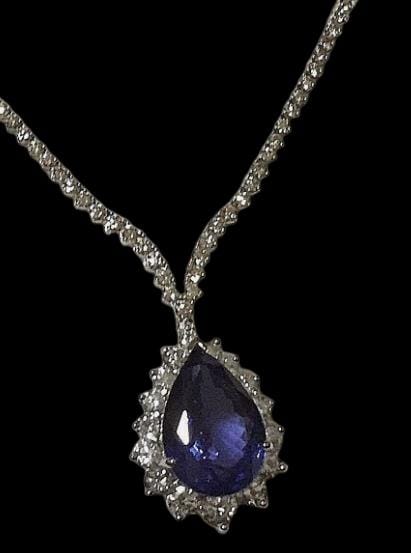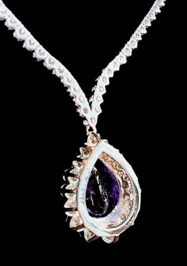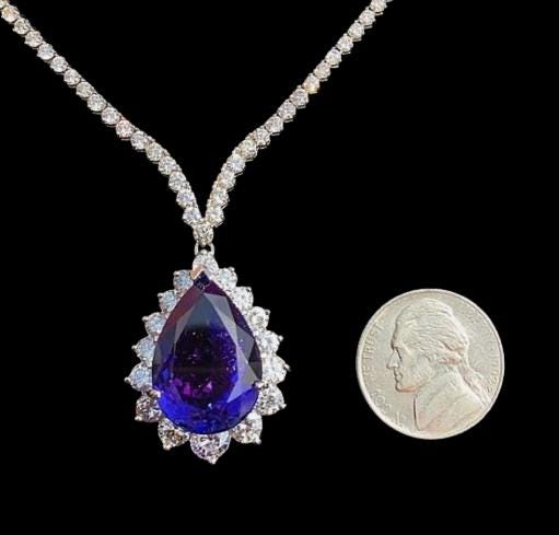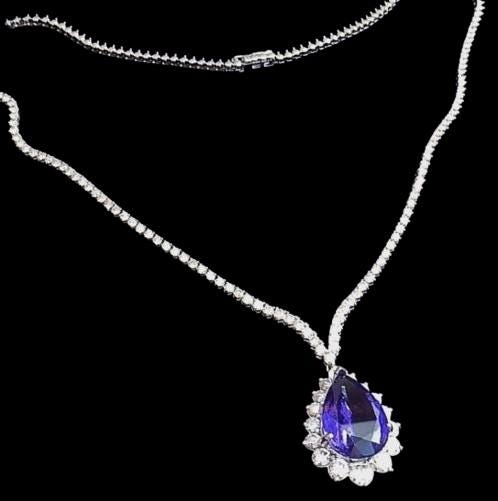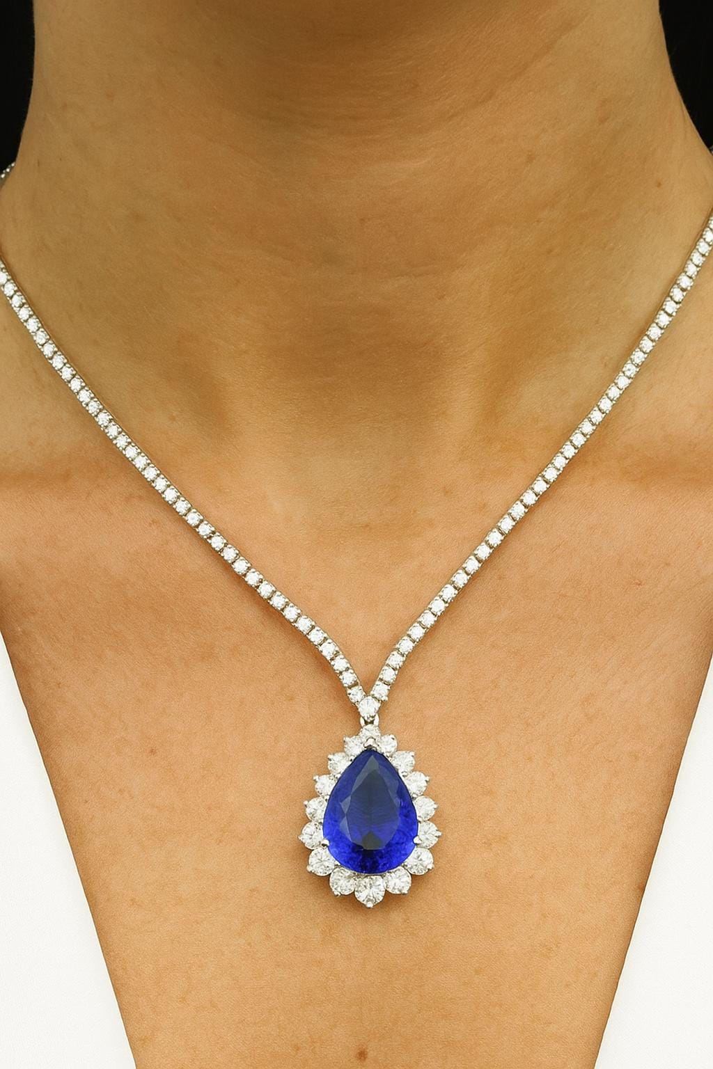 The centerpiece tanzanite, weighing an impressive 16.95 carats, is cut into a stunning pear shape that reflects light beautifully from every angle. It is surrounded by a halo of brilliant-cut diamonds, totaling 6.82 carats, adding breathtaking sparkle and enhancing the gemstone’s deep, royal glow. Each diamond is natural, earth-mined, and carefully handset in luxurious 18K solid white gold, giving the necklace a perfect balance of brilliance and refinement.